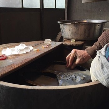 切断した石の美しさを最大限に引き出すため、一つひとつ手作業で丁寧にカット面をつけ「削り」出していきます。1面1面丁寧にカットを施すことで石の持つ個性を活かし最適な形に仕上げていきます。