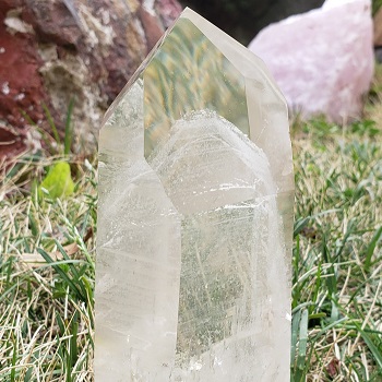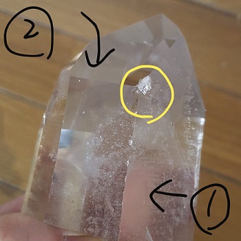 水晶のポイントの欠け直しの依頼です。角面の欠けと画像①と②を削ってバランスを取ります。加工した面に加え全面も磨きを行い光輝く水晶ポイントに磨き上げ納品しました。 ※原石は10cm程度までが研磨可能となります。