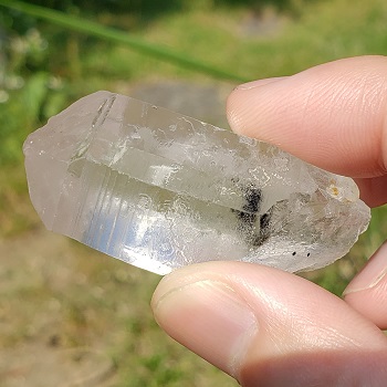 水晶のポイントの透明度が高い部分のみを使用してペンダントトップをご希望。不純物が多い部分を切り離し、残った透明で綺麗な部分をラフカットしました。